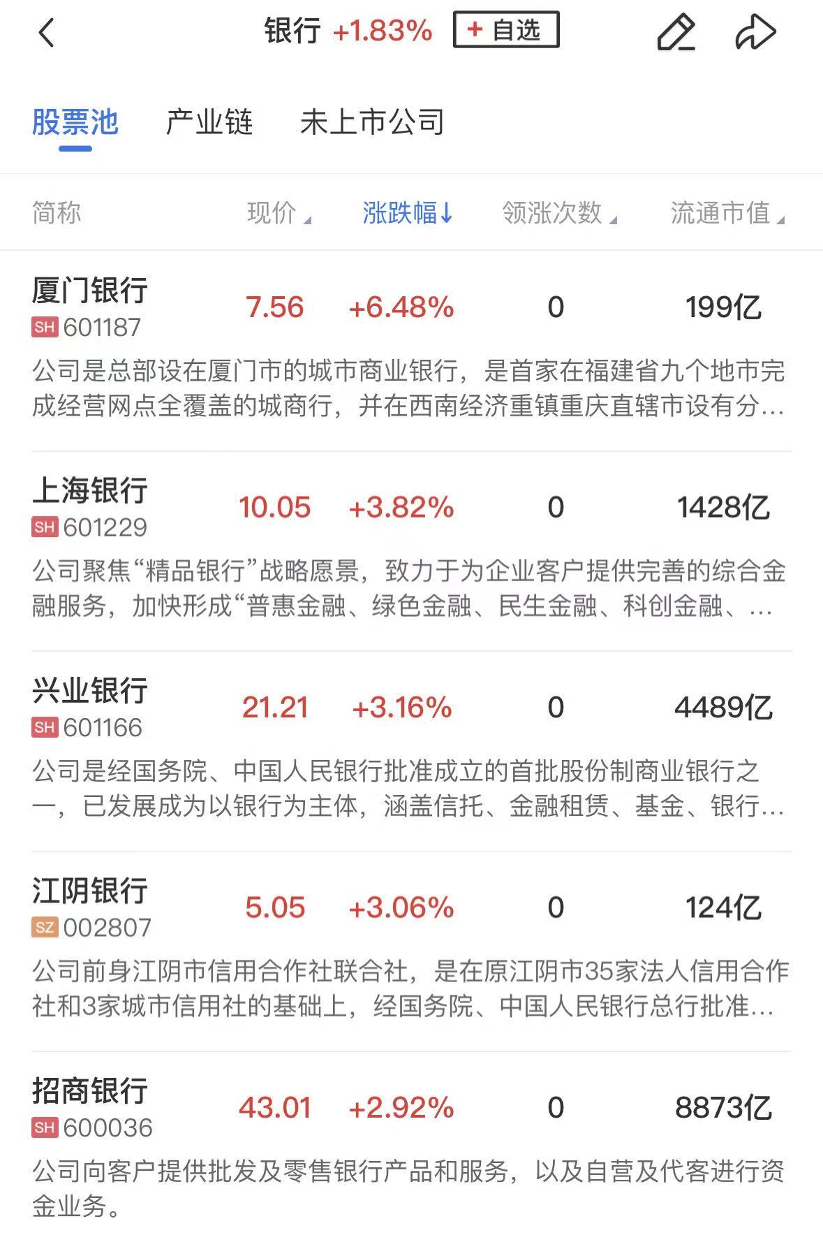 银行板块逆势活跃,厦门银行涨超6%,上海银行、兴业银行、江阴银行、招商银行、工商银行等涨幅居前。
