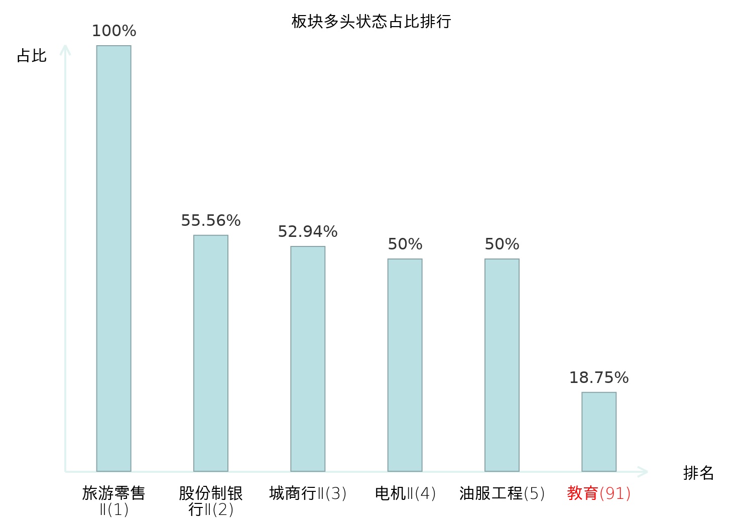 全市场所有行业板块中主力多头状态占比排名中,旅游零售Ⅱ板块位居第一。互联网电商板块名次提升最快,较昨日上升65位。