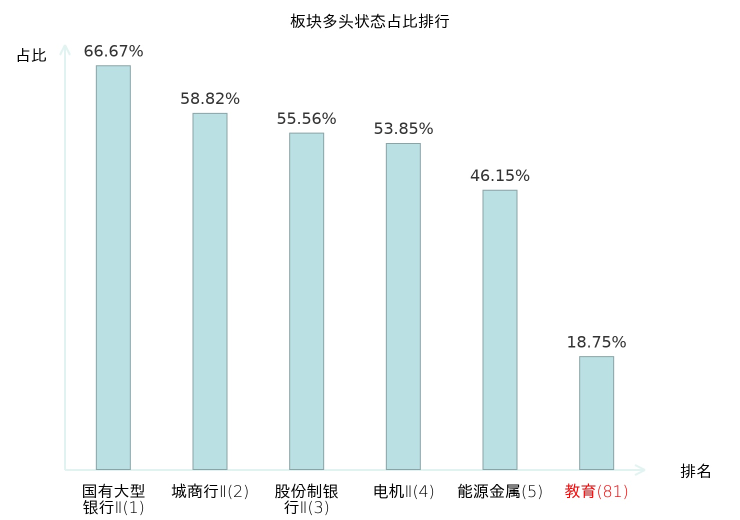 全市场所有行业板块中主力多头状态占比排名中,国有大型银行Ⅱ板块位居第一。自动化设备板块名次提升最快,较昨日上升57位。
