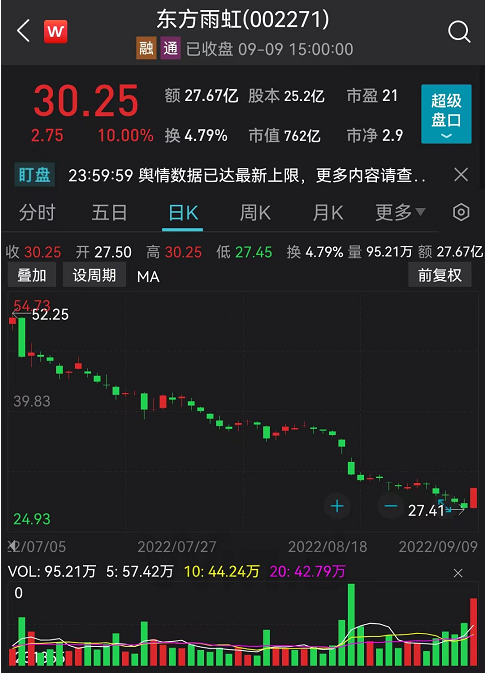 昨日刚创出逾两年来的新低27.41元/股后,有“防水茅”之称的东方雨虹今日开盘后震荡走高,尾盘封住涨停,收报30.25元/股,市值762亿元。