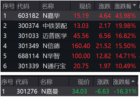 今日上市的五只新股表现延续了近期的分化局面。截至收盘,主板新股N嘉华大涨43.98%;科创板新股N华智上涨14.71%;创业板新股N信德和N通行宝分别上涨15.5%和10.49%;同为创业板新股的N嘉曼,下跌16.31%。