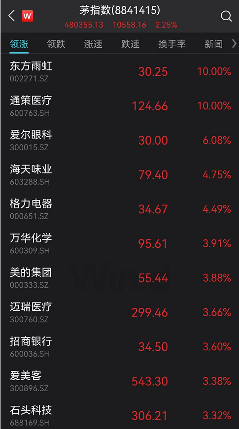 除了房地产板块外,今日市场表现较为突出的是茅指数板块。截至收盘,除了“防水茅”,涨停的还有“牙茅”通策医疗。此外,“眼茅”爱尔眼科涨逾6%,“酱油茅”海天味业涨逾4%,“化工茅”万华化学上涨近4%,“银行茅”招商银行、“女人的茅台”爱美客均涨逾3%,贵州茅台涨逾1.6%。