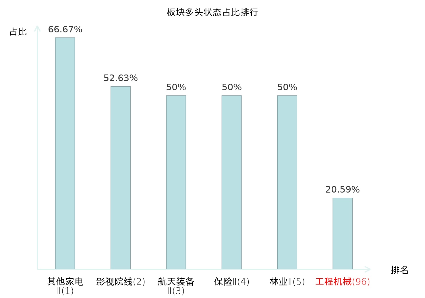 全市场所有行业板块中主力多头状态占比排名中,其他家电Ⅱ板块位居第一。林业Ⅱ板块名次提升最快,较昨日上升76位。