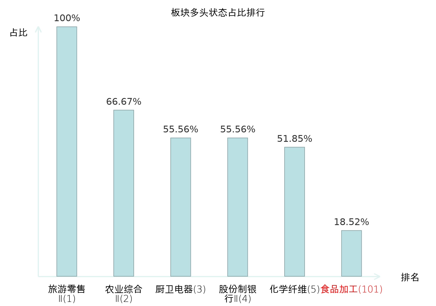 全市场所有行业板块中主力多头状态占比排名中,旅游零售Ⅱ板块位居第一。国有大型银行Ⅱ板块名次提升最快,较昨日上升103位。