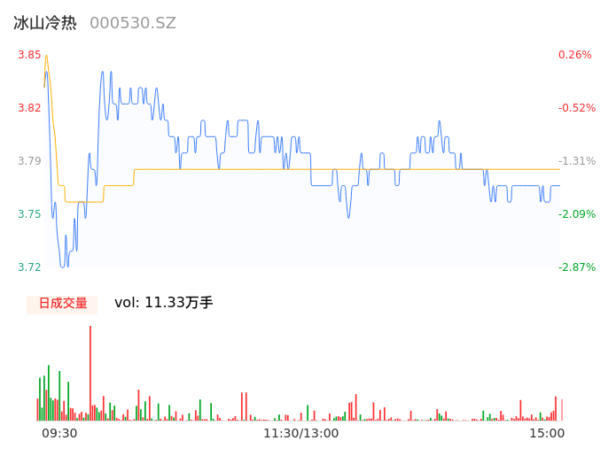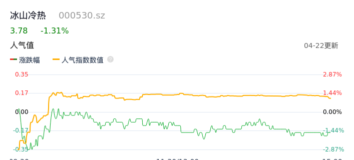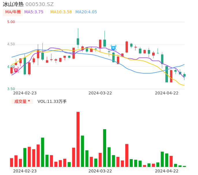 04月22日,冰山冷热收报3.78,股价涨幅-1.31%,成交金额4285.02万元,换手率1.89%。