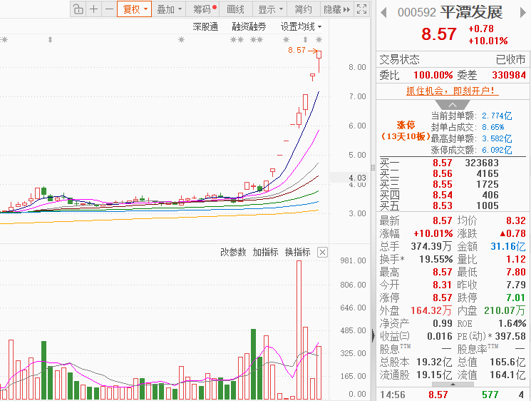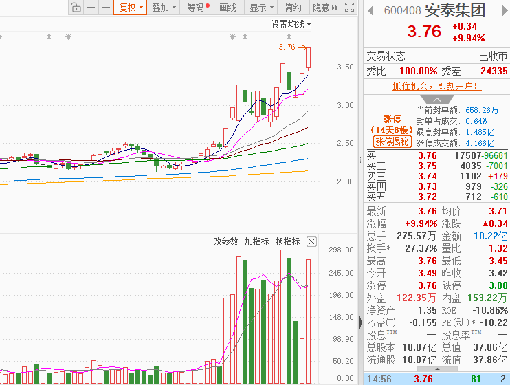 市场情绪:市场热点较为杂乱,全市场超3600只个股下跌。近四个交易日中出现三次调整,成交量萎缩至不足2万亿元,较前一日减少1900亿元,市场情绪明显转向谨慎。今日全市场共50股涨停,连板股总数14只,18股封板未遂,封板率为73%(不含ST股、退市股)。焦点股方面,海峡两岸概念股平潭发展13天10板、合富中国6连板、达华智能9天5板,并购重组的盈新发展12天9板,煤炭股安泰集团14天8板。