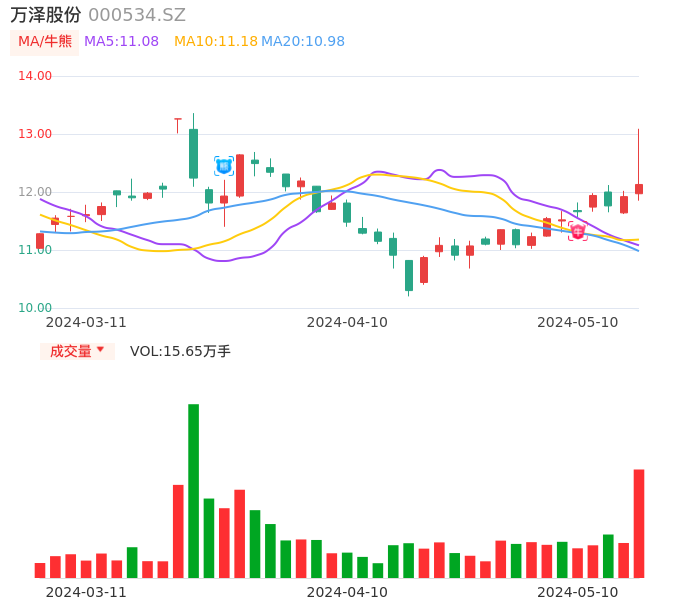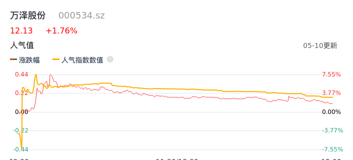 05月10日,万泽股份收报12.13,股价涨幅1.76%,成交金额1.94亿元,换手率3.14%。