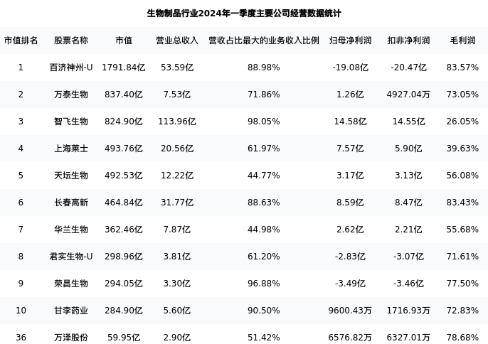 万泽股份最新报告期数据为一季度,下表汇总了生物制品行业内市值靠前的公司一季度主要经营数据