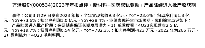 值得注意的是:2024年03月民生证券的尹会伟/宋丽莹/孔厚融/赵博轩/冯鑫分析师,首次发布关于万泽股份的研究报告,标题为:万泽股份(000534)2023年年报点评:新材料+医药双轨驱动;产品陆续进入批产收获期。