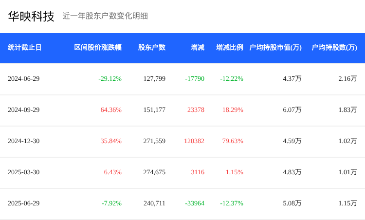 在2025年第二季度,华映科技(000536)的股东户数从一季度末的27.44万减少到24.07万,减少3.37万,环比下降12.37%。与此同时,户均持股数量环比上升14.11%,达至5.08万股,户均持股市值同样上涨5.08%,显示出股东集中度有所提升。
