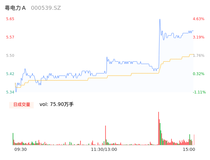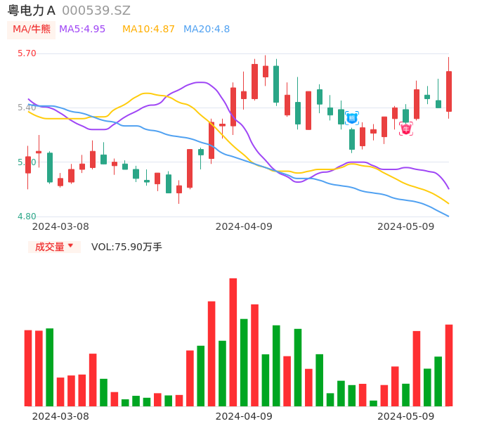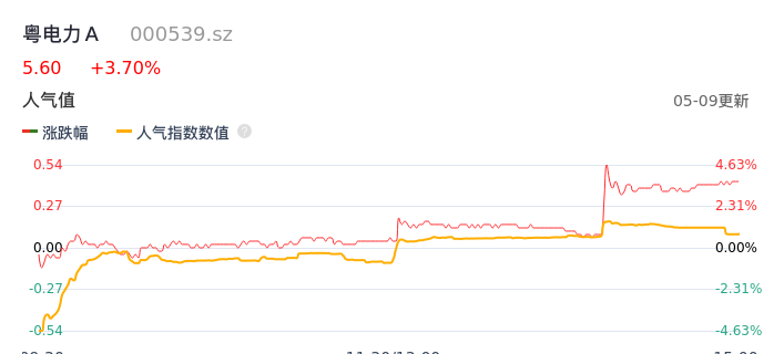 05月09日,粤电力A收报5.60,股价涨幅3.70%,成交金额4.17亿元,换手率2.97%。
