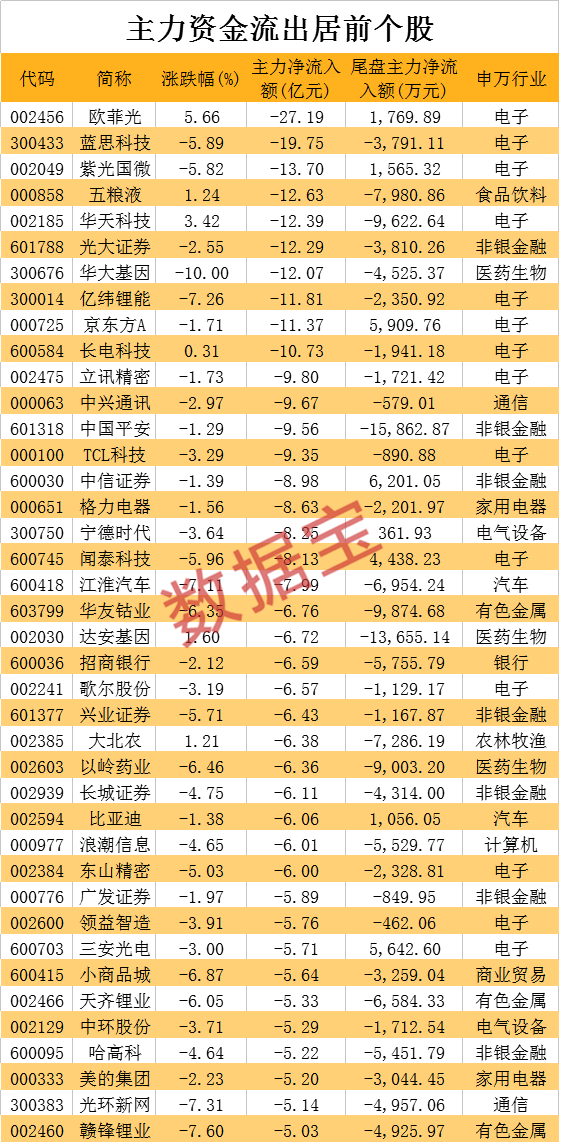 从行业来看,申万28个行业主力资金全部净流出,电子行业流出金额超300亿元,医药生物、计算机两个行业流出金额均超百亿元。共计23个行业流出资金超10亿元。