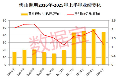 2025年半年报显示,佛山照明(000541.SZ)正面临严峻的经营挑战。公司上半年实现营业总收入43.86亿元,同比下滑8.34%;实现归母净利润1.15亿元,同比下降40.18%。与历史对比,公司营收增速降至近5年同期新低;净利润增速则降至近10年新低。