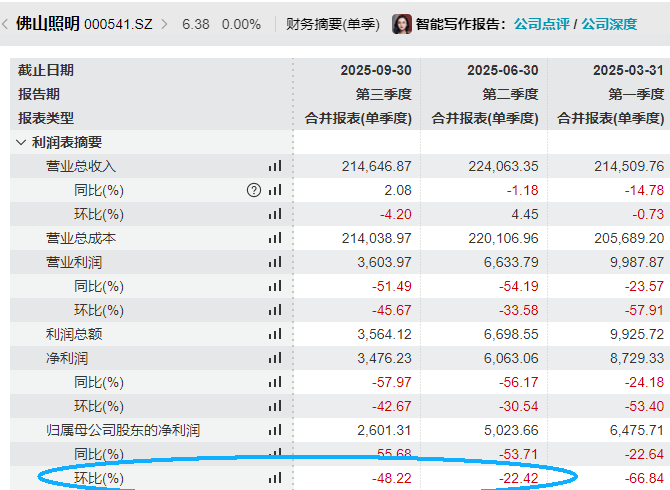 从单季度数据来看,Wind显示,这已经是佛山照明连续三个季度归母净利润同比环比双下滑。其中,第三季度环比下降48.22%,比第二季度的环比降幅扩大25.8个百分点。
