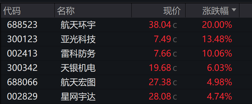 航天环宇尾盘读秒前录得20%涨停,航天发展午后封板,银河电子、雷科防务、普天科技、顺灏股份等多股此前涨停。