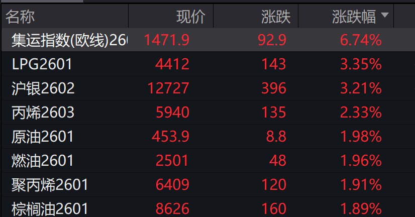 商品:收盘多数上涨,集运指数(欧线)涨6.74%,LPG涨3.35%,沪银涨3.21%,沪锡涨1.53%,焦炭跌1.99%。