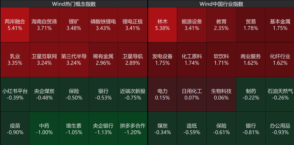 盘面上,个股涨多跌少,沪深京三市超4100股飘红,今日成交近1.6万亿。板块方面,两岸融合、海南自贸港等区域概念强势领涨,锂矿、磷酸铁锂电等新能源资源板块集体走强,乳业、卫星互联网等消费与科技题材表现活跃;下跌方面,银行、保险等金融板块普遍调整,疫苗、中药等医药板块同步走弱,拼多多合作、小红书平台等互联网概念持续低迷。