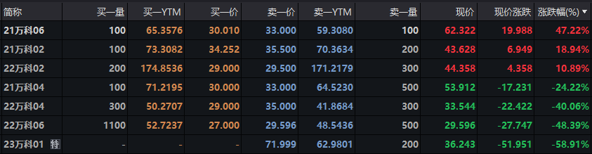 万科境内债今日走势分化,截止收盘,“21万科06”涨超47%,“22万科04”、“22万科06”均跌超40%,“23万科01”跌近59%。