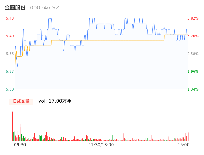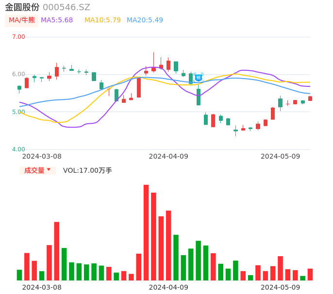 05月09日,金圆股份收报5.41,股价涨幅3.44%,成交金额9174.13万元,换手率2.39%。