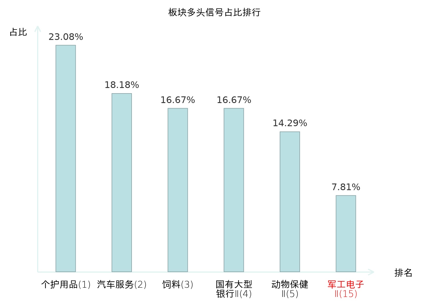 全市场所有行业板块中主力多头信号占比排名中,个护用品板块位居第一。国有大型银行Ⅱ板块名次提升最快,较昨日上升119位。