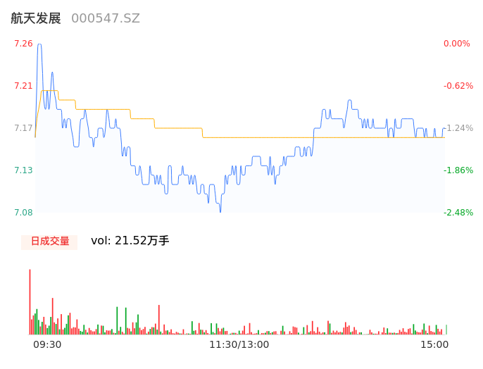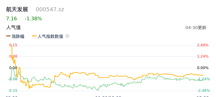 04月30日,航天发展收报7.16,股价涨幅-1.38%,成交金额1.54亿元,换手率1.36%。