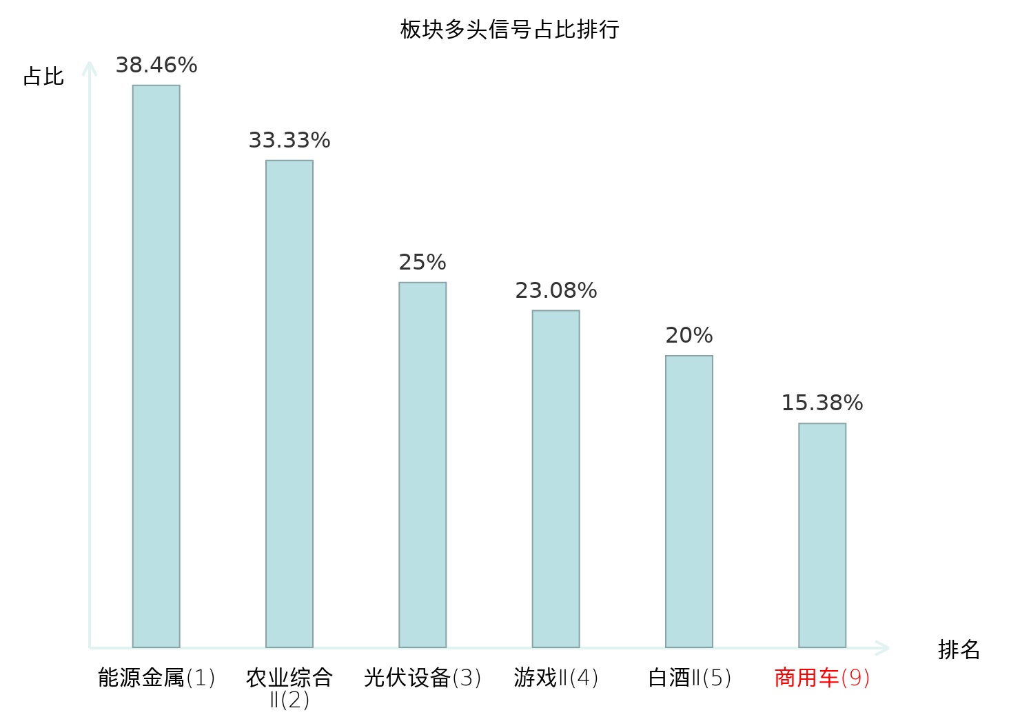 全市场所有行业板块中主力多头信号占比排名中,能源金属板块位居第一。农业综合Ⅱ板块名次提升最快,较昨日上升126位。