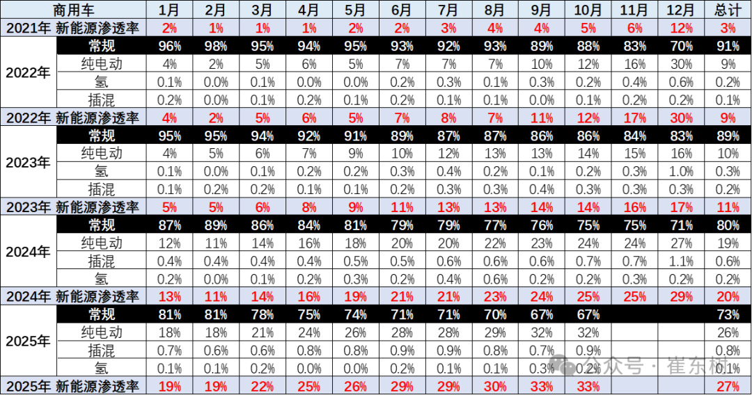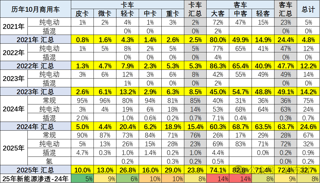 从2019-2021年,整个新能源商用车的渗透率在3%左右水平,2022年达到9%,2023年达到11%,2024年全年达到20%,2025年1-10月就达到渗透率27%的良好水平,体现了新能源商用车强势增长良好态势。