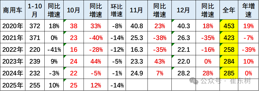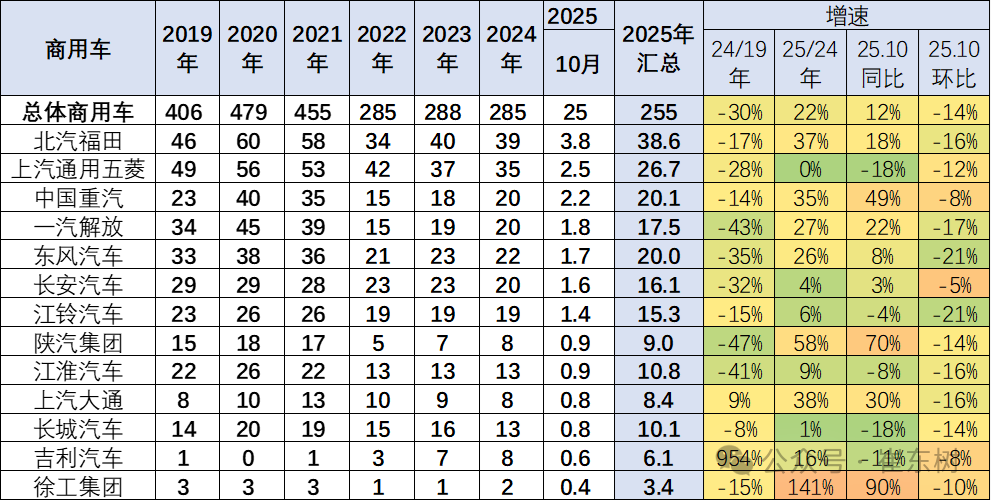 10月商用车国内销量实现25万台,同比增12%,环比降14%。2025年1-10月商用车国内销量实现255万台,同比增长10%,相对于2022年以来的商用车平稳期,今年创出近几年新高的良好水平。