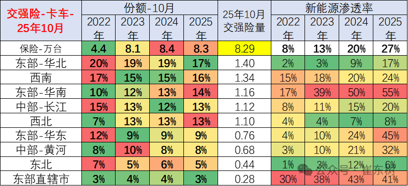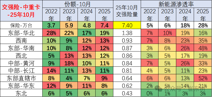 总体中重型卡车在华北等地区市场份额较高,但近两年的华南、西南持续走强。而新能源重卡在京津沪、华南、中部黄河和西南地区等渗透率表现较好,其中京津沪的渗透率提升较快。