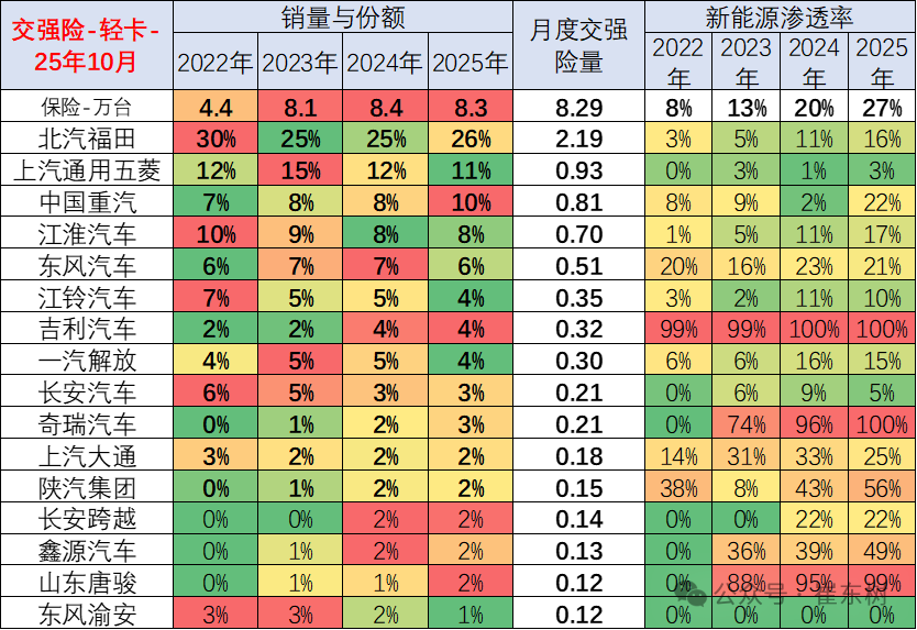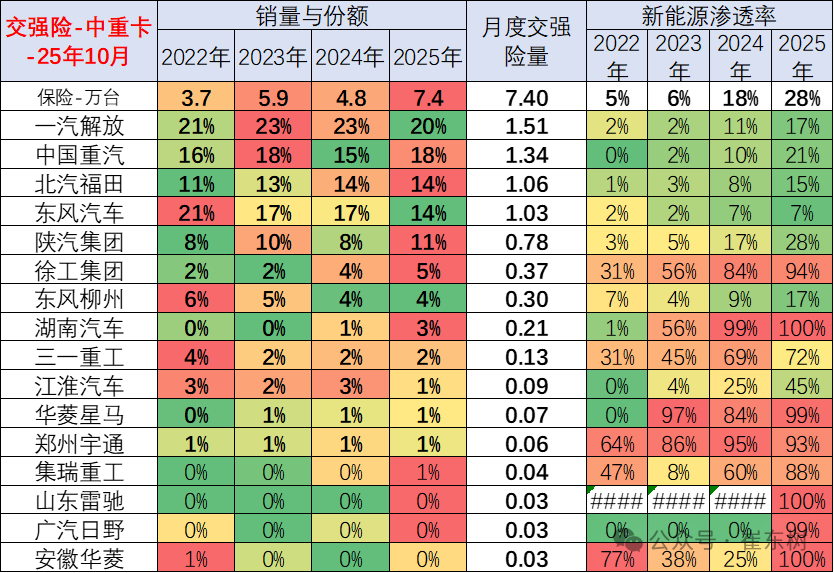 国内市场中重卡市场表现最为优秀的应该是一汽解放、中国重汽、福田、东风汽车等企业。重卡总体表现相对平稳,徐工等部分重卡二线车企电动车渗透率提升。去年出口力度很强,今年国内新能源较多,今年10月燃油车暂时较低。