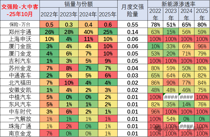 新能源大中客渗透率高的企业主要是二线企业,主力企业都是燃油车的新能源全面发展的,且主力企业的燃油车市场不错。