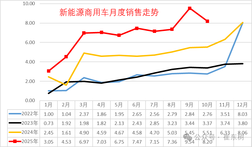 2025年新能源商用车整体呈现快速拉升的良好局面。3-10月持续高位,新能源增长较强。2025年10月的新能源销量迅速达到8.2万台的高位,说明新能源的需求旺盛。