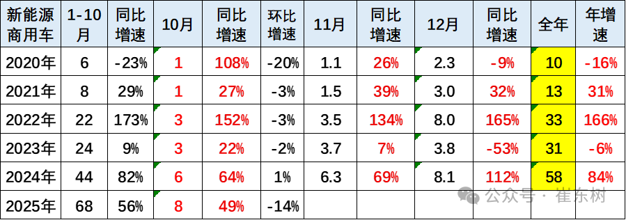 2024年新能源商用车销量57.9万台,同比增长84%;2025年10月份新能源商用车达到8.2万台,同比增长49%,环比降14%.。在2024年末政策翘尾后,2025年1月新能源表现相对较弱,2-9月同比暴增,1-10月累计达到68万台,同比增长56%。