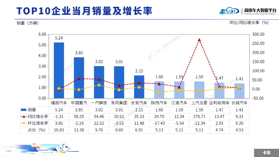 当月TOP5企业销量占比为52.46%,依次为福田汽车、中国重汽、长安汽车、东风集团、一汽解放。