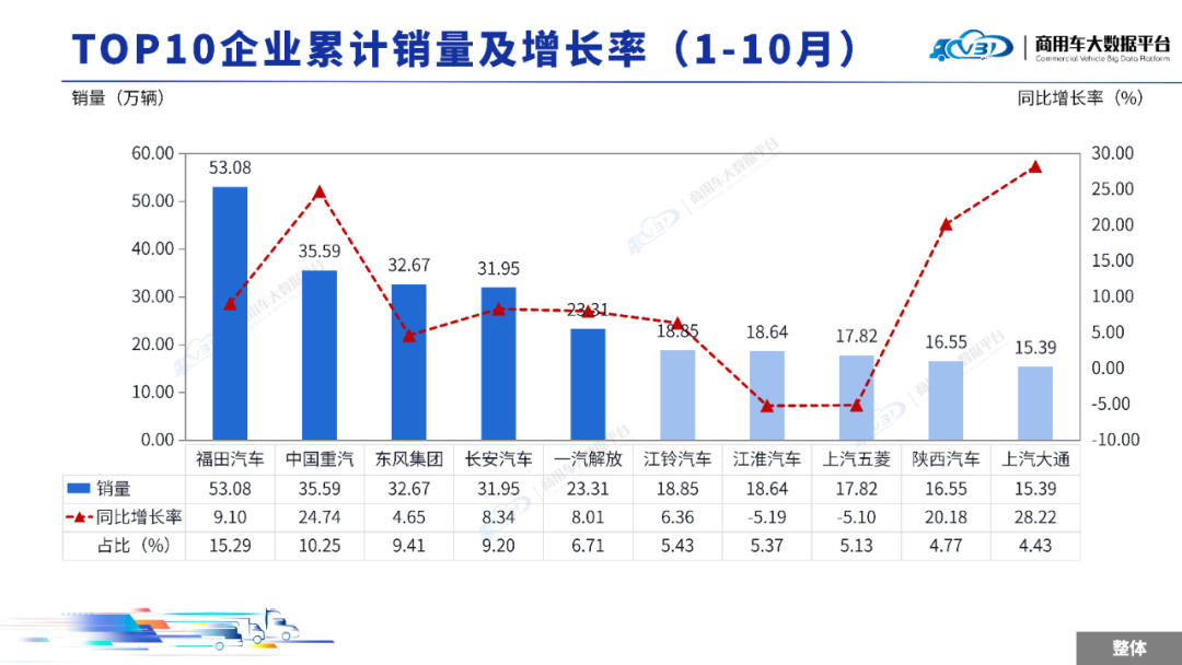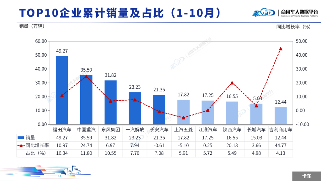 1-10月累计TOP5企业销量占比为50.86%,依次为福田汽车、中国重汽、东风集团、长安汽车、一汽解放。