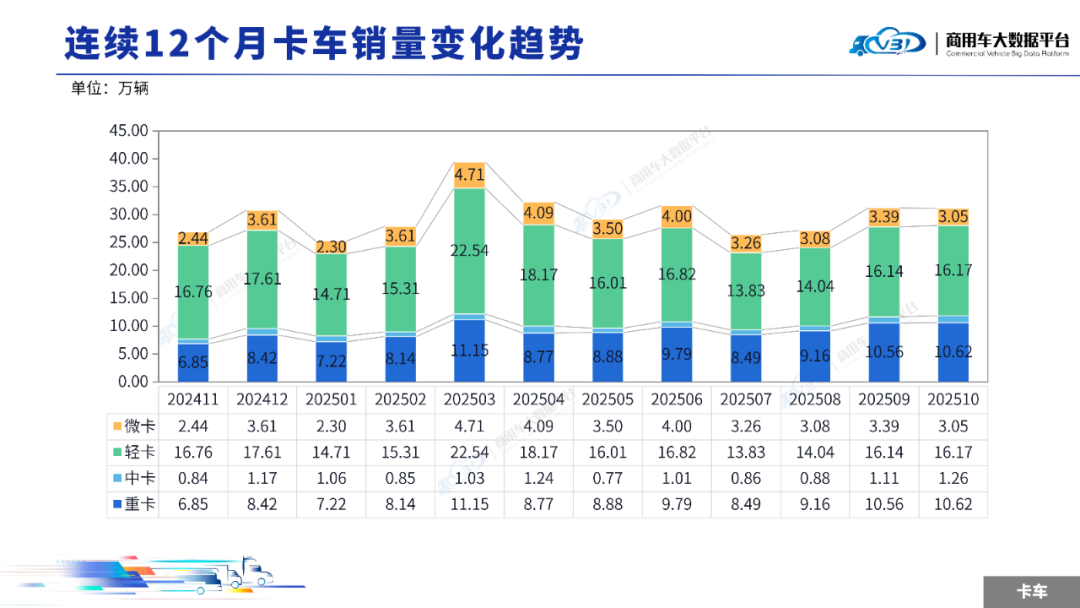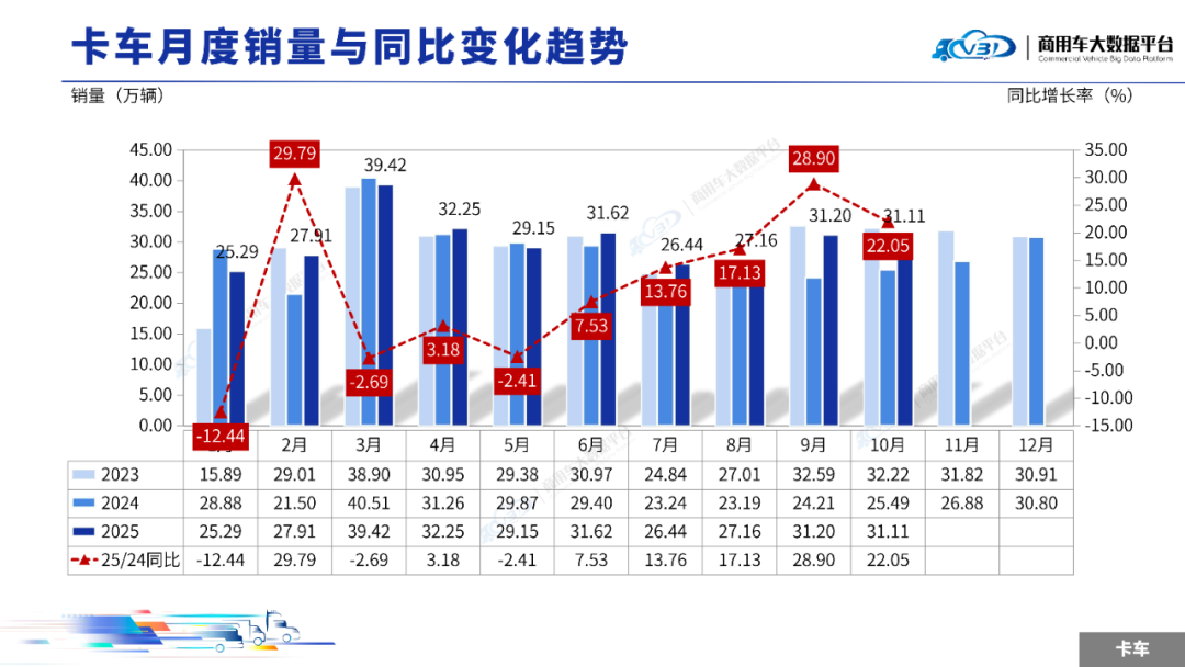 2025年10月卡车销量(批发)为31.11万辆,同比增长22.05%,环比下降0.29%;1-10月卡车累计销量(批发)301.55万辆,同比增长8.65%。