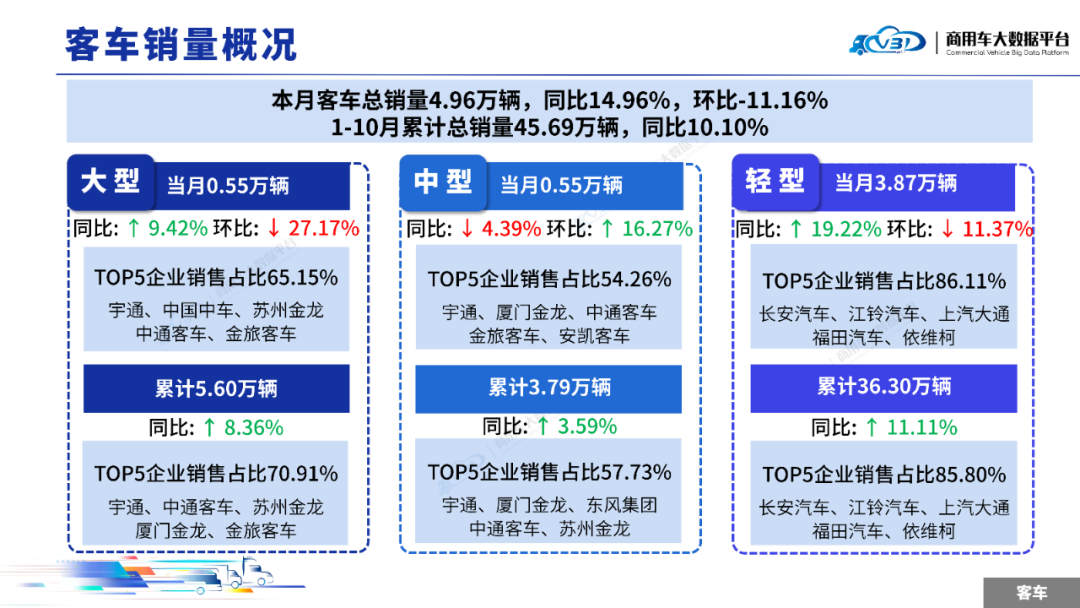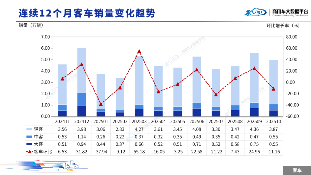 2025年10月,客车销量(批发)为4.96万辆,同比增长14.96%,环比下降11.16%;1-10月客车累计销量(批发)45.69万辆,同比增长10.10%。