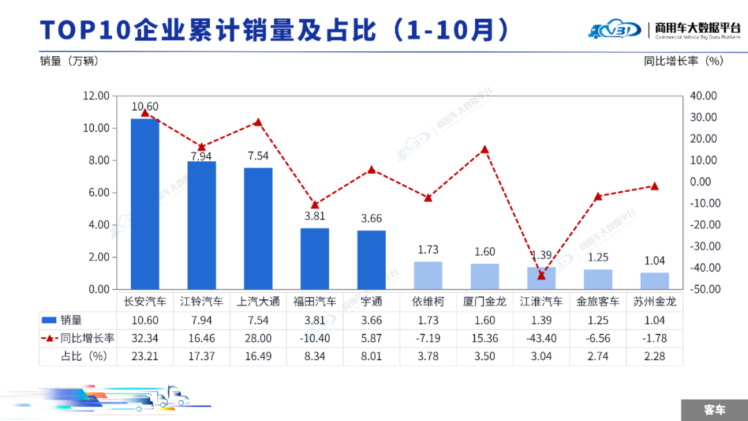 1-10月客车TOP5企业销量占比为73.41%,依次为长安汽车、江铃汽车、上汽大通、福田汽车、宇通。