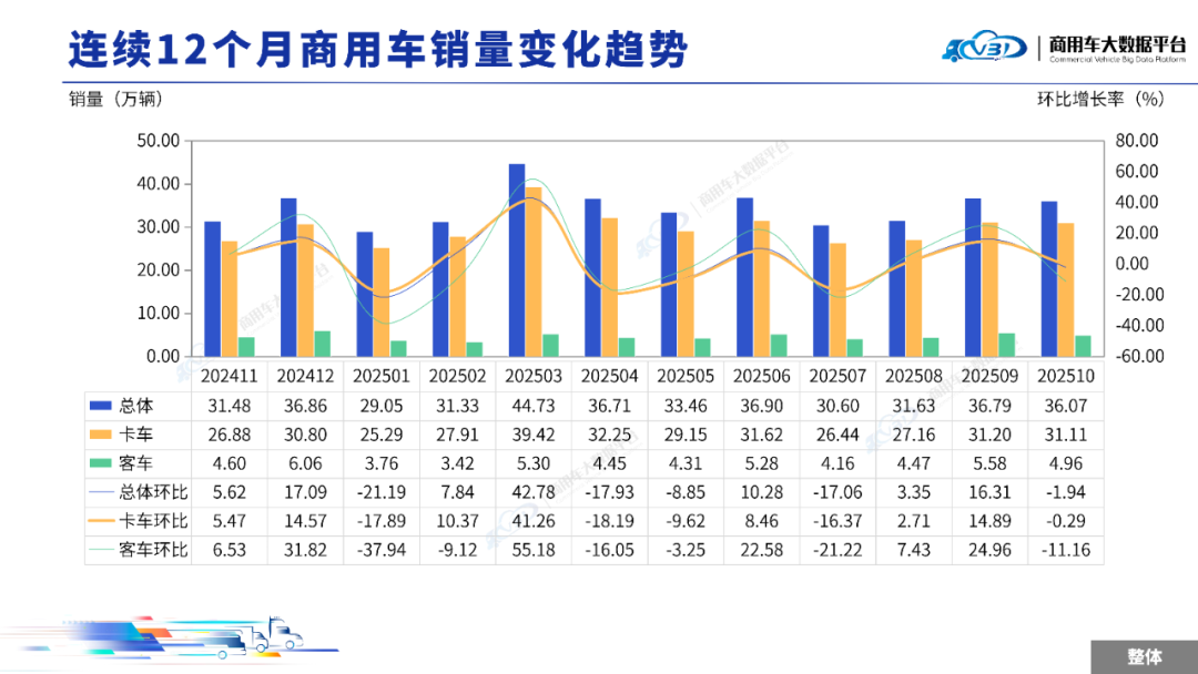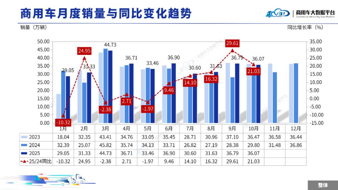 2025年10月全国商用车整体销量(批发)为36.07万辆,同比增长21.03%,环比下降1.94%;1-10月全国商用车累计整体销量(批发)为347.24万辆,累计同比增长8.84%。