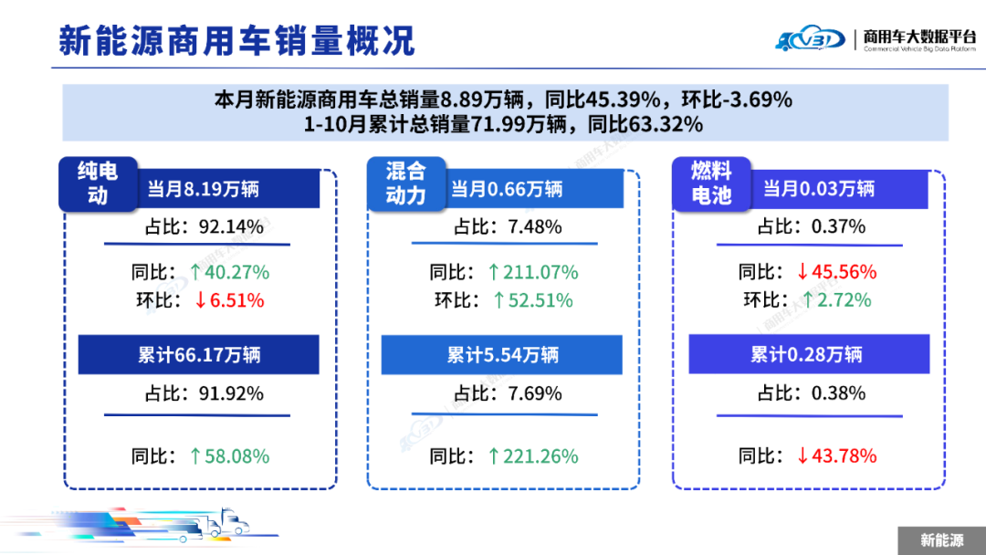 智通财经APP获悉,中国汽车流通协会发布《2025年10月全国商用车销量概况(批发)》。2025年10月新能源商用车销量(批发)为8.89万辆,同比增长45.39%,环比下降3.69%;1-10月累计销量(批发)71.99万辆,同比增长63.32%。