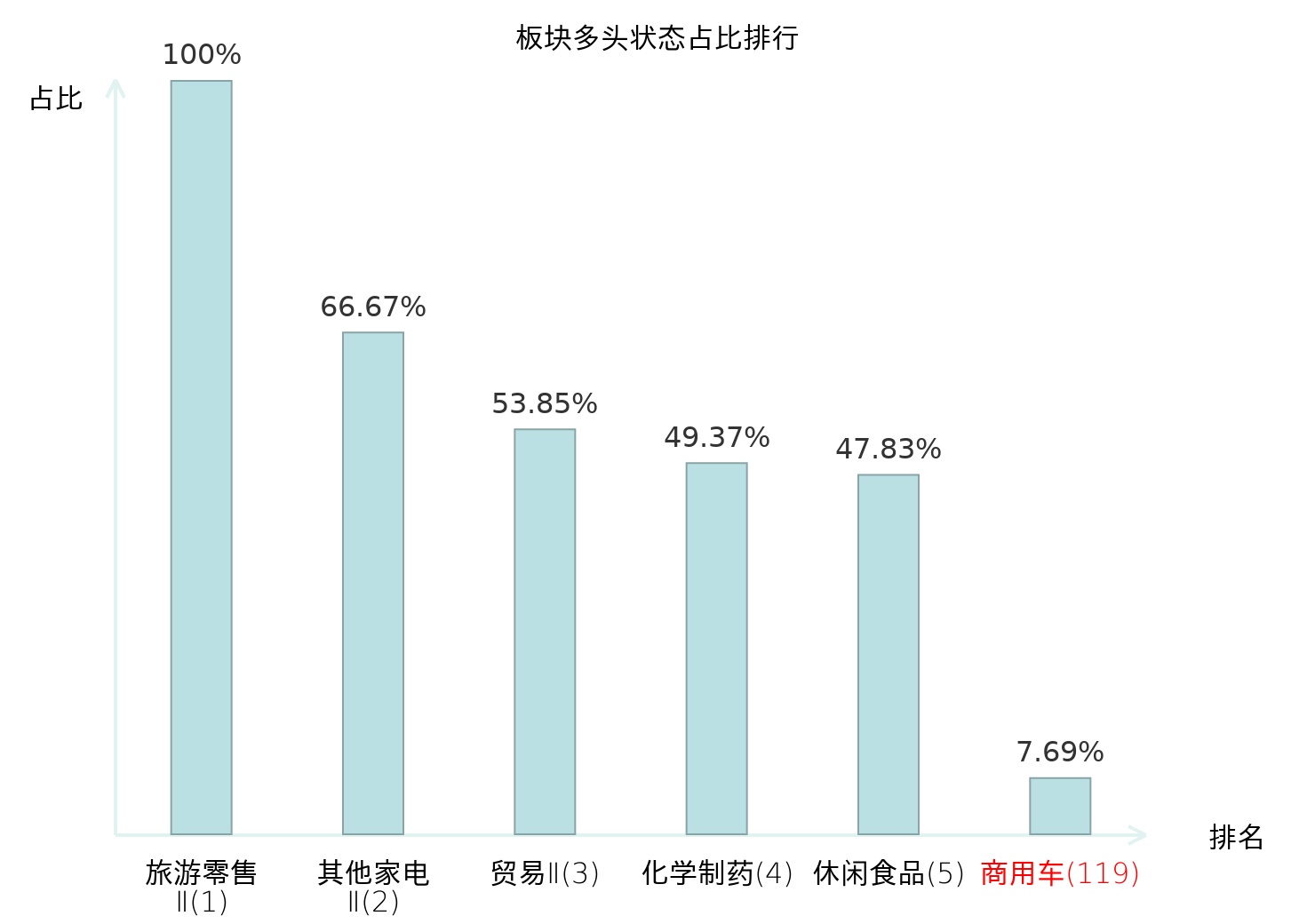 全市场所有行业板块中主力多头状态占比排名中,旅游零售Ⅱ板块位居第一。互联网电商板块名次提升最快,较昨日上升55位。