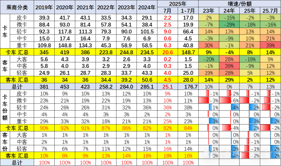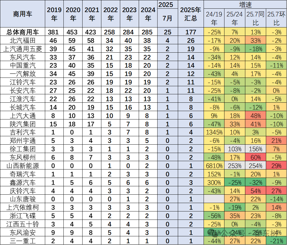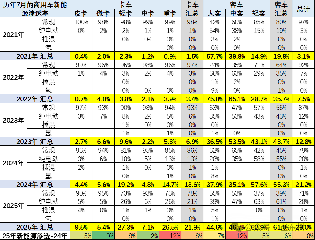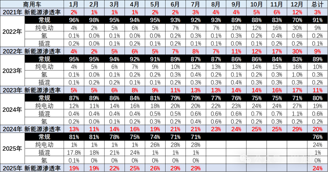 从2019-2021年,整个新能源商用车的渗透率在3%左右水平,2022年达到9%,2023年达到11%,2024年全年达到20%,2025年1-7月就达到渗透率24%的良好水平,体现了新能源商用车强势增长良好态势。