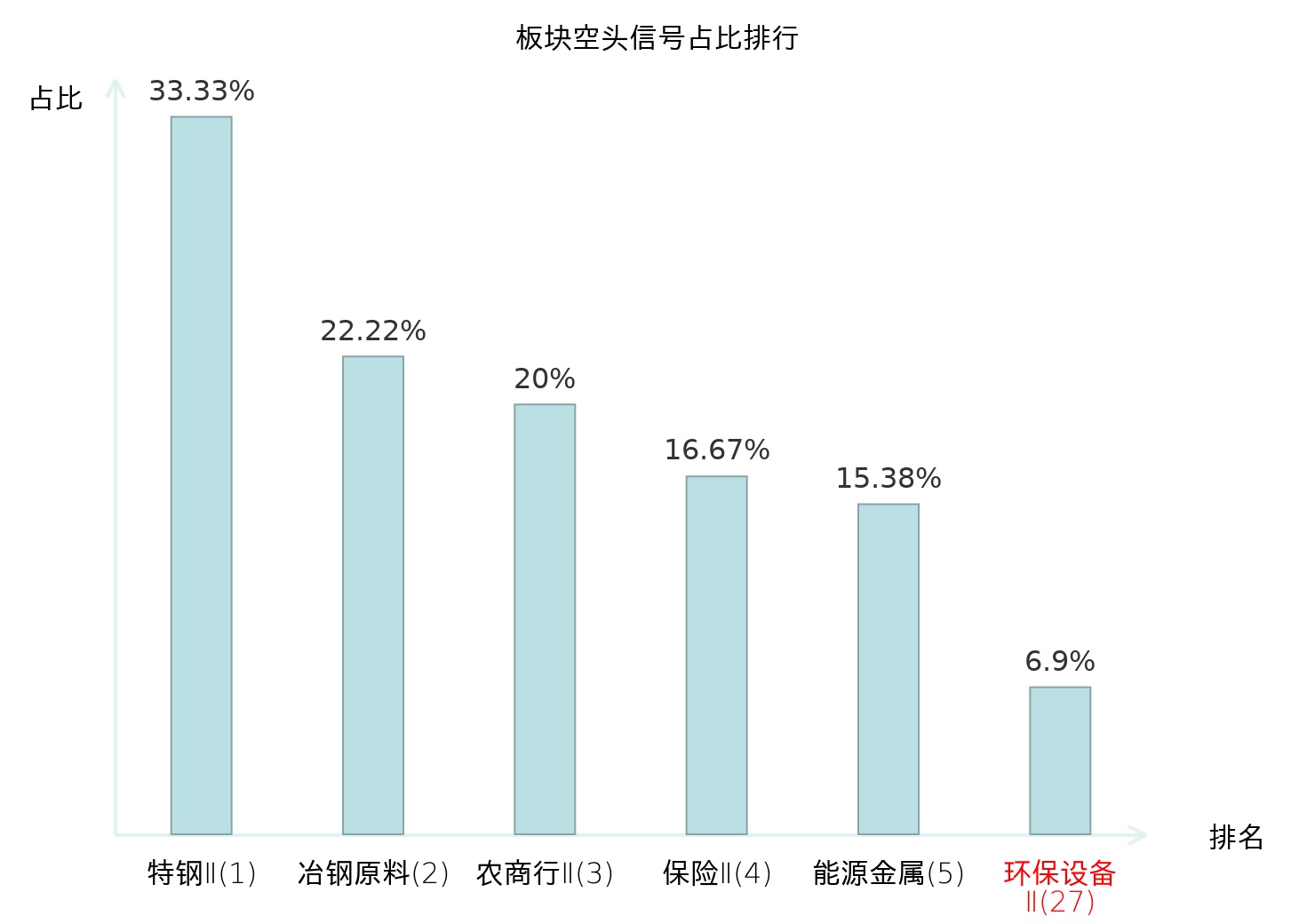 全市场所有行业板块中主力空头信号占比排名中,特钢Ⅱ板块位居第一。其他电子Ⅱ板块名次提升最快,较昨日上升117位。