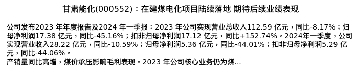 值得注意的是:2024年05月国投证券的周喆分析师,首次发布关于甘肃能化的研究报告,标题为:甘肃能化(000552):在建煤电化项目陆续落地 期待后续业绩表现。