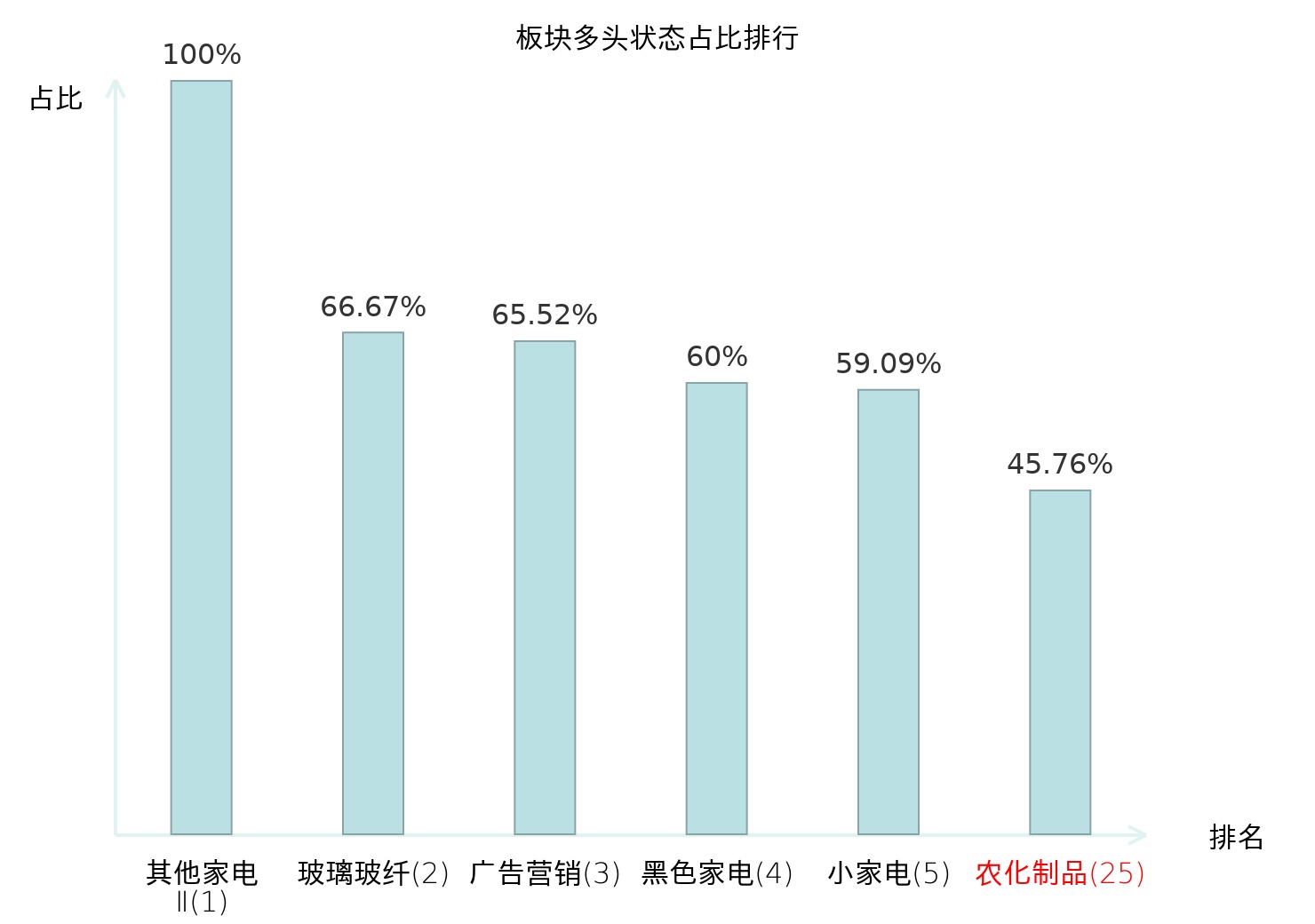 全市场所有行业板块中主力多头状态占比排名中,其他家电Ⅱ板块位居第一。航天装备Ⅱ板块名次提升最快,较昨日上升79位。
