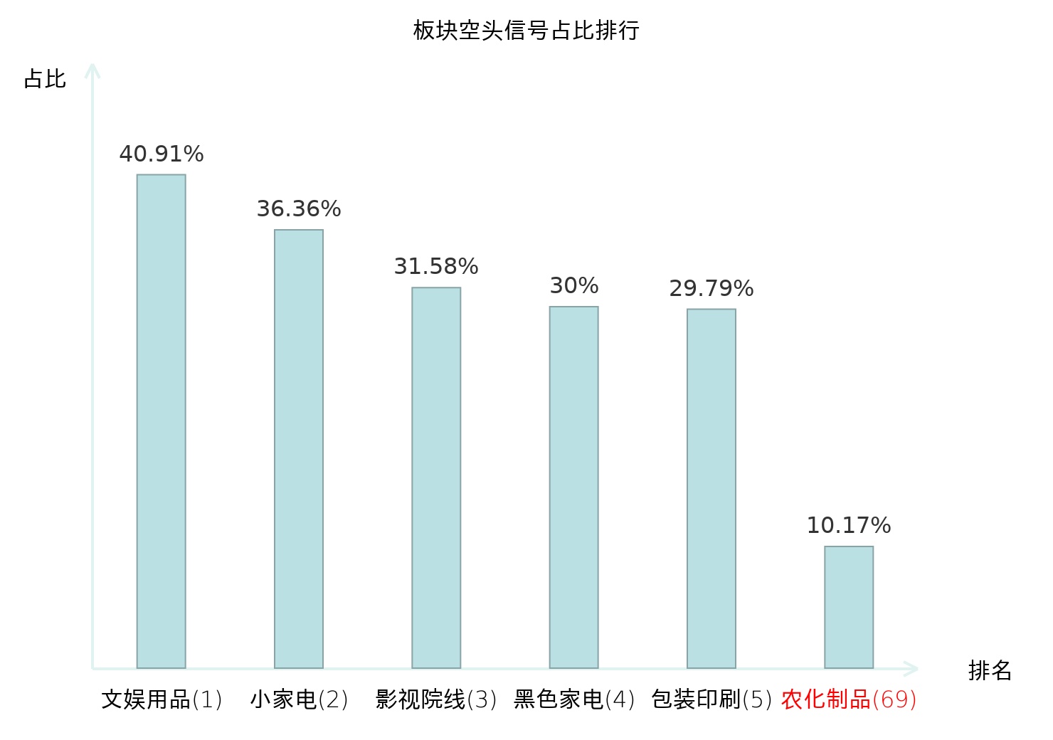 全市场所有行业板块中主力空头信号占比排名中,文娱用品板块位居第一。包装印刷板块名次提升最快,较昨日上升124位。