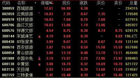 国庆中秋假期临近,提振旅游出行板块,旅游股盘中集体走高,截至收盘,西域旅游涨超12%,盘中创出新高;云南旅游涨停斩获3连板,桂林旅游、曲江文旅亦涨停,中国中免等涨超3%。