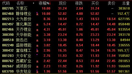 锂矿概念发力走高,市值超千亿的赣锋锂业涨停,大为股份涨超8%,雅化集团涨逾5%,天齐锂业涨超4%。