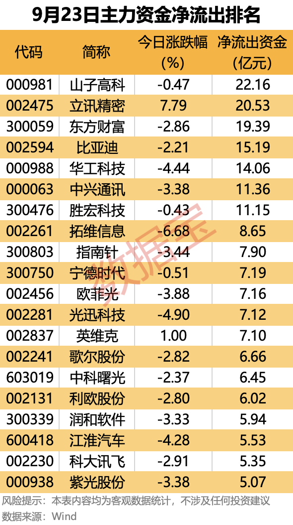 7股主力资金净流出均超11亿元,其中山子高科、立讯精密主力资金净流出均超20亿元。立讯精密涨7.79%,全天成交额超360亿元,居A股第一。