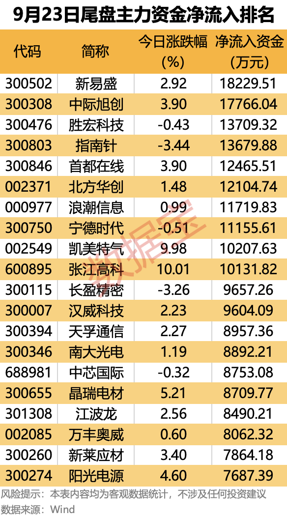 从个股来看,18股尾盘主力资金净流入金额均超8000万元,10股尾盘主力资金净流入均超1亿元。